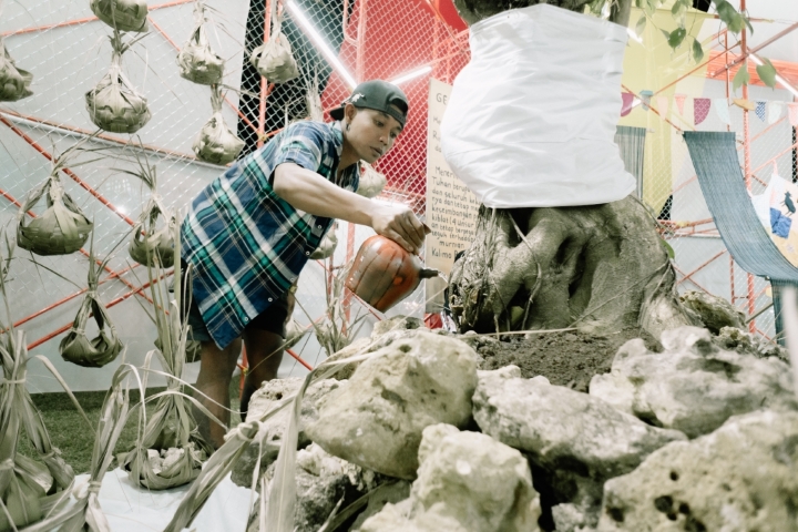 Melalui bahan Mambu Ampo—aroma tanah basah saat hujan pertama—Shodik menelusuri ingatan ekologis masyarakat tentang awal siklus pertanian dan kehidupan. Sementara Resan Gunungkidul, lewat praktik Gégér Labuhdan Genduren, menegaskan relasi ritual dan keseharian warga dengan bumi sebagai laku syukur dan kesadaran kosmologis antara jagat alit dan jagat gede.